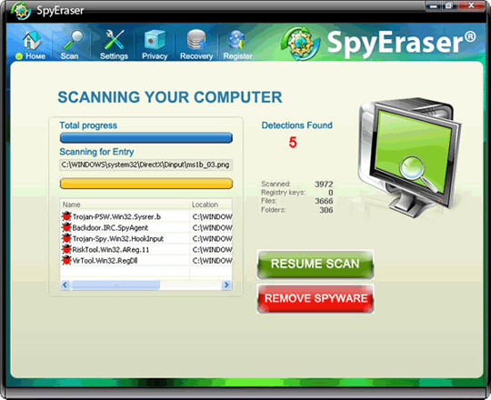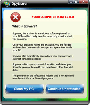 Thành viên tiếp theo trong bảng danh sách này là SpyEraser – được phát hiện bởi Kaspersky Lab, nhưng lại không liệt vào dạng biến thể FraudTool.Win32.SpyEraser.b. Phần mềm giả mạo này được phát triển và lây lan qua trang web www.spyeraser-security.com và www.spyeraser-trial.com. Sau khi cài đặt thành công SpyEraser trên máy tính, chương trình sẽ tự động tạo ra số lượng nhất định các file rỗng với nhiều tên gọi khác nhau trong các thư mục hệ thống như C:\Windows và C:\Windows\System32. Khi tiến hành quét, SpyEraser sẽ tự động phát hiện những file này là mã độc và yêu cầu người dùng mua key kích hoạt chương trình.
