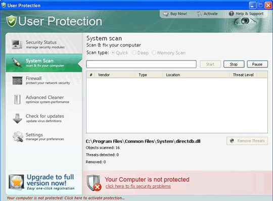 Là 1 trong những biến thể gần đây nhất của dòng Dr. Guard và PaladinAntivirus. Mỗi khi máy tính khởi động, User Protection sẽ đưa ra cảnh báo lỗi hệ thống bị ảnh hưởng nghiêm trọng bởi Trojan, worm và virus, đồng thời yêu cầu người sử dụng mua bản quyền hoặc key kích hoạt chương trình để xử lý triệt để những lỗi trên.