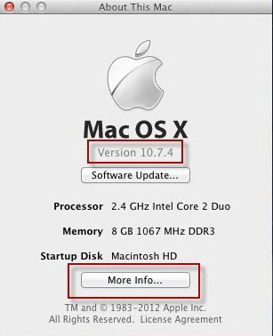 Trước hết, hãy chắc chắn rằng máy Mac được cập nhật đầy đủ và chạy OS X 10.7.4 Lion. Kích vào biểu tượng Apple và About This Mac. Người dùng sẽ nhận được một màn hình liệt kê những thông tin cơ bản về máy mình.