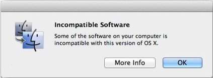 Sau khi Mountain Lion đã được cài, có thể xuất hiện cảnh báo phần mềm bất tương thích được cài trên máy như sau.