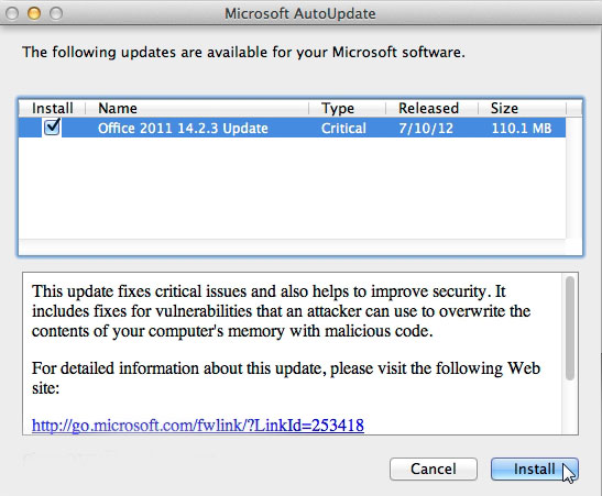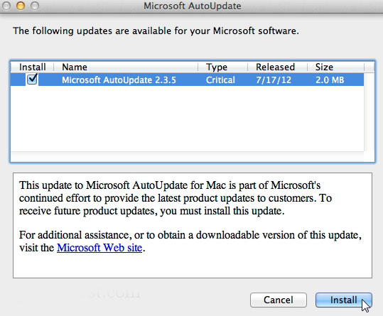 Cũng lưu ý rằng Office for Mac 2011 vẫn hoạt động nhưng có một vài bản cập nhật quan trọng đã xuất hiện. Nếu đã kích hoạt Microsoft AutoUpdate thì nó sẽ thông báo để bạn có thể cài đặt phiên bản AutoUpdate mới.