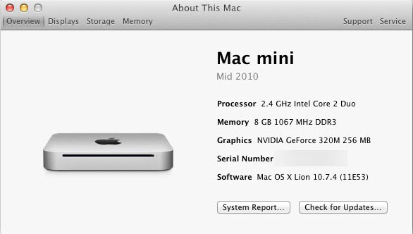 Nhấn vào More Info để biết thêm thông tin chi tiết về máy. Như ta thấy, dòng sử dụng cho bài viết là Mac Mini Mid 2010 với chip Intel Core 2 Duo, 8GB RAM và chạy OS X Lion 10.7.4 (11E23). Kích vào Check for Updates.