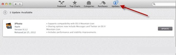 Sau khi OS được cập nhật hoàn toàn, mở Mac App Store và kiểm tra các bản cập nhật cho ứng dụng đã được cài đặt. Ví dụ ở đây có một bản cập nhật trên máy là iPhoto.