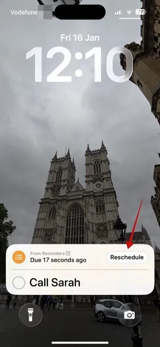 Sau khi bạn nhấn nút Stop (hoặc Slide to Stop), một biểu ngữ Hoạt động Trực tiếp sẽ hiện lên bao gồm tên của lời nhắc. Quan trọng nhất, từ đây bạn có thể nhấn Reschedule, thao tác này sẽ đưa bạn đến ứng dụng Reminders, nơi bạn có thể đặt lời nhắc cho thời gian hoặc ngày sau đó. Bạn cũng có thể tắt công tắc Urgent nếu bạn nghĩ rằng nó không còn cần thiết nữa.
