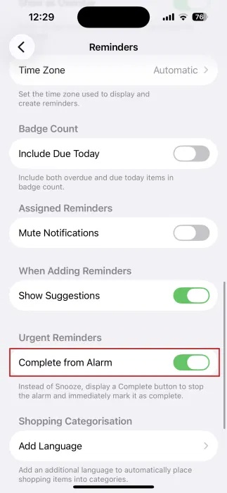 Bật tùy chọn Complete from Alarm trong mục Urgent Reminders.