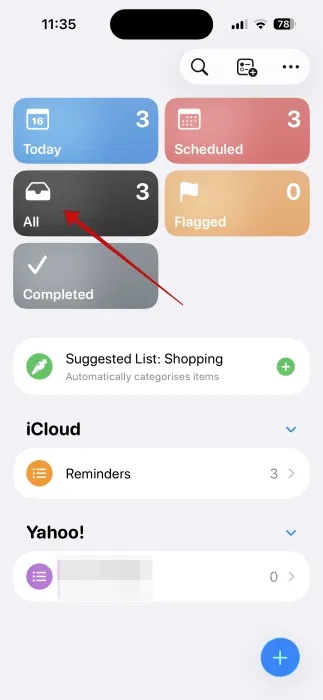 Mở ứng dụng Reminders trên iPhone của bạn và tạo lời nhắc mới bằng cách nhấn vào nút "+" màu xanh ở góc dưới bên phải.