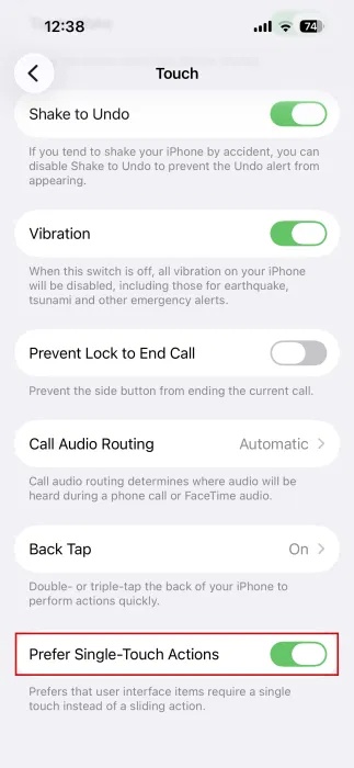 Trong trường hợp bạn muốn, bạn có thể thay đổi nút Slide to Stop thành Stop. Để làm như vậy, hãy vào Settings → Accessibility → Touch. Bật Prefer Single-Touch Actions.