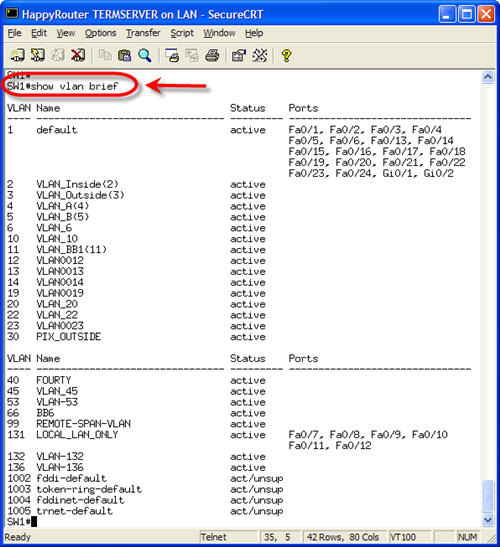 Như bạn đã biết, nếu một thiết bị được đặt trên VLAN có lỗi, nó không thể kết nối tới máy chủ. Để hiển thị thiết bị nào đang ở VLAN, dùng lệnh show vlan brief.