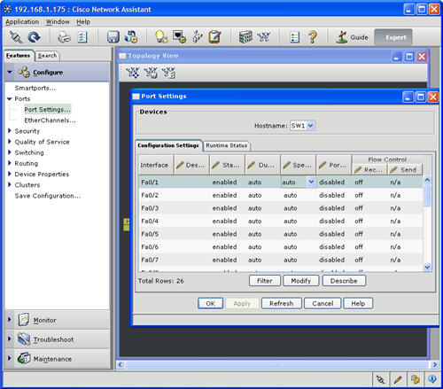 Từ đây, bạn có thể cấu hình trạng thái, duplex, tốc độ cho các cổng switch của mình. Thực tế, bạn có thể cấu hình hầu hết các tính năng của switch bằng CNA. Nên nhớ rằng đối với tất cả các switch của Cisco, bạn có thể cấu hình bằng web. Tuy nhiên, cấu hình bằng web lại có nhiều hạn chế hơn so với cấu hình bằng CNA. Bạn có thể cấu hình bằng web thông qua chính trình duyệt của mình hoặc có thể thực hiện thông qua CNA. Sau đây là màn hình ví dụ của Cisco 3550 bằng web.