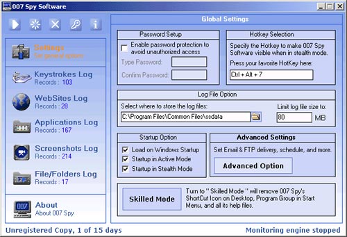 1. 007 Spy Software: Keylogger này chủ động dấu mình trong C:\Program Filess\Common Files\Microsoft Shared\DAO; File thực thi có tên svchost.exe; Sử dụng tổ hợp phím Ctrl+Alt+Shift+F7 để kích hoạt; Có khả năng âm thầm gửi đi các thông tin mà nó ghi nhận được đến một địa chỉ e-mail hoặc máy chủ FTP; Nó “ma mãnh” đến nỗi lưu các file TXT ghi nhận hoạt động bàn phím cùng như file JPG chụp ảnh màn hình trong một thư mục vô cùng “đặc biệt”, đó là C:\Recycled\WinLiveUpdate32\scrdata\, tức nó dấu dữ liệu trong… thùng rác của máy tính.
