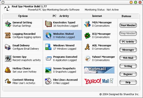 5. Real Spy Monitor: Cài đặt mặc định trong thư mục C:\Program Files\Real Spy Monitor; File thực thi mang tên winrsm.exe; Sử dụng phím nóng Ctrl+Alt+S; Chụp ảnh màn hình dưới dạng file JPG, ghi nhận hoạt động bàn phím dưới dạng file TXT và dấu tất cả trong thư mục mặc định là C:\Windows\RSM; Có khả năng bí mật gửi các thông tin ghi nhận được về một e-mail hay máy chủ FTP nào đó. Chương trình được thiết kế hết sức quy mô với giao diện ghi nhận hoạt động riêng dành cho từng kiểu ứng dụng vô cùng trực quan.