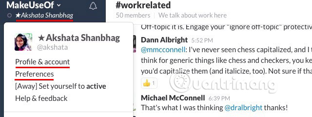 Lưu ý: Bạn sẽ tìm thấy các cài đặt Slack quan trọng nhất ở hai nơi: Preferences và Profile & Account > Account. Bạn có thể truy cập chúng thông qua menu popup ẩn đằng sau tên của bạn trong thanh sidebar.