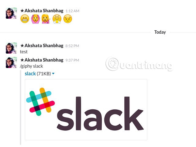 Ví dụ, bạn có thể sử dụng /dm @username để gửi thư trực tiếp đến một người nào đó. Sử dụng /away để chuyển trạng thái của bạn. Với từ khóa /giphy, bạn có thể yêu cầu Slack tìm một GIF thích hợp.