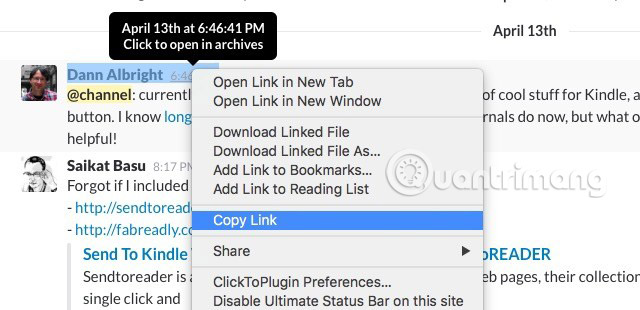 Để trích dẫn lại bất kỳ tin nhắn nào, hãy nhấp chuột phải vào dấu thời gian của nó và sao chép liên kết của nó từ menu ngữ cảnh, rồi dán vào tin nhắn mới. Tất nhiên, hãy sử dụng điều này một cách hạn chế để các kênh không bị lấp đầy với các tin nhắn được trích dẫn, thay vì các tin nhắn trực tuyến.