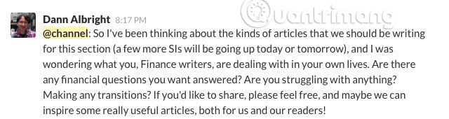 Suy nghĩ kỹ trước khi bạn sử dụng lệnh thông báo. Lệnh @channel gửi đến tất cả thành viên thông báo bằng email, bất kể họ có đăng nhập hay không và liệu họ có đang hoạt động hay không. Tương tự như vậy, lệnh @group thông báo cho tất cả các thành viên của một nhóm và @everyone thông báo cho tất cả các thành viên trong nhóm của bạn (và bạn chỉ có thể sử dụng nó trong kênh mặc định, #general).