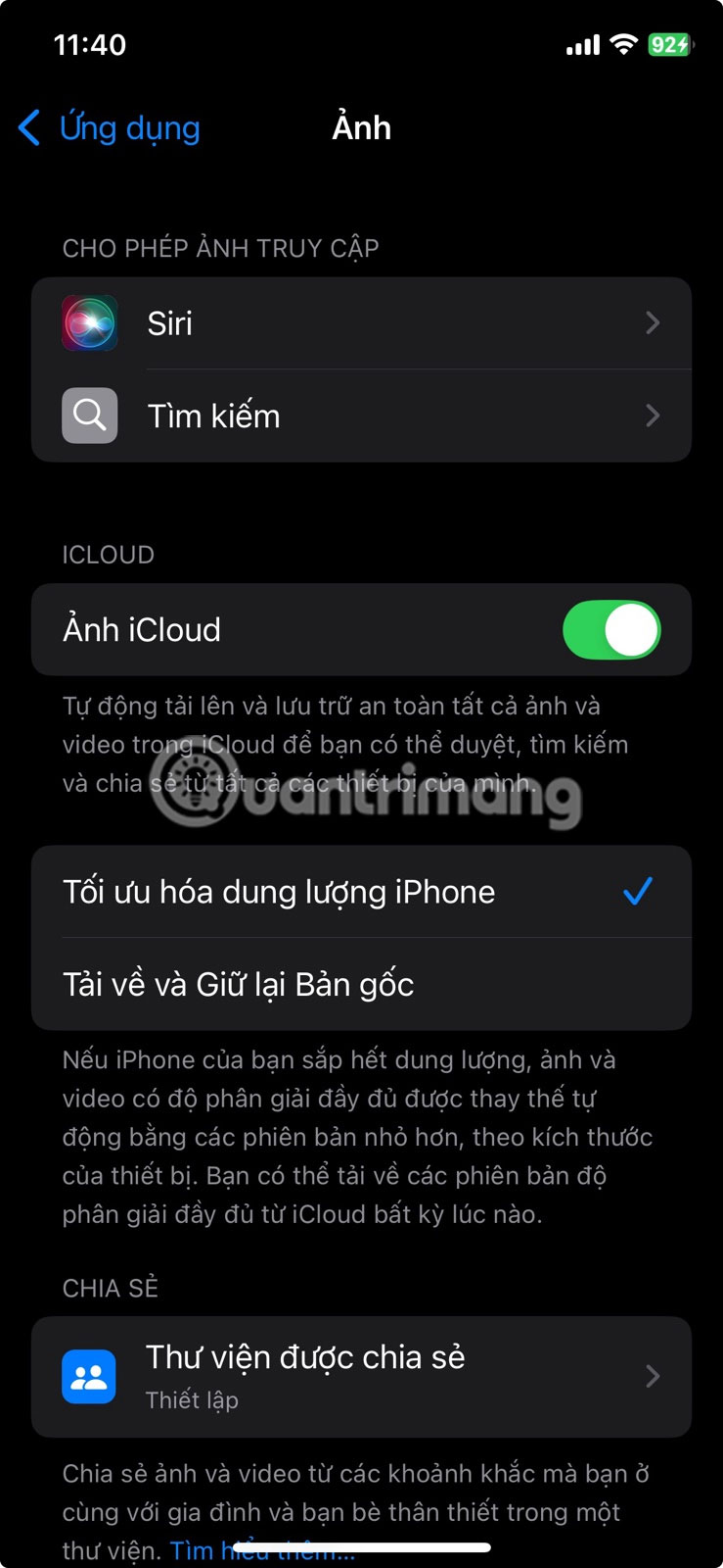 Để thiết lập tính năng này, hãy vào Cài đặt > Ảnh, bật Ảnh iCloud và chọn Tối ưu hóa dung lượng iPhone. Nếu bạn có một thư viện lớn, bạn có thể thấy nhiều gigabyte được giải phóng chỉ trong vài ngày.