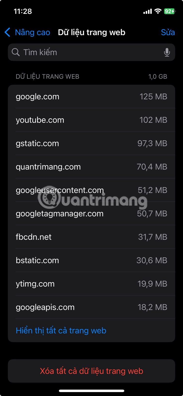 Để chính xác hơn, hãy nhấn Nâng cao > Dữ liệu trang web để xem và xóa dữ liệu có chọn lọc khỏi các trang web cụ thể.