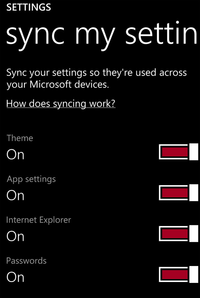 Settings >> Sync my settings và chọn mục bạn muốn đồng bộ với Windows (8/8.1), bao gồm: Theme, App settings, Internet Explorer và Passwords. Tôi khuyên bạn nên chọn hết, không có gì hại cả.