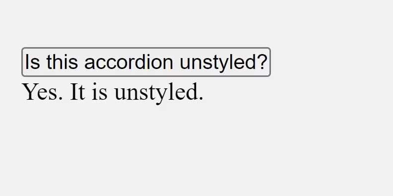 import React from "react" import * as Accordion from "@radix-ui/react-accordion" export default function App() { return ( <div> <Accordion.Root type="single" defaultValue="item-1" collapsible> <Accordion.Item value="item-1"> <Accordion.Trigger>Is this accordion unstyled?</Accordion.Trigger> <Accordion.Content>Yes. It is unstyled.</Accordion.Content> </Accordion.Item> </Accordion.Root> </div> ) }Khối code trên thiết lập thành phần accordion chưa được tạo kiểu bằng thư viện @radix-ui/react-accordion, cho phép thu gọn các mục với nội dung có thể tùy biến.