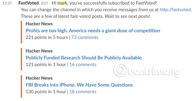 Giống như HNSlack, FastVoted mang đến cho bạn những “bài viết thịnh hành” trong kênh Slack của bạn, có nguồn từ Product Hunt, Hacker News, Twitter và Reddit. Không có quá 15 tin nhắn được gửi mỗi ngày, vì vậy bạn không phải lo lắng về việc có một loạt các spam đánh vào kênh của bạn.