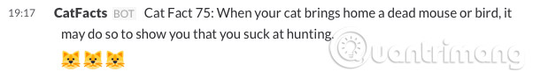 Nếu bạn là một người yêu mèo, thì bạn sẽ yêu Cat Facts. Khi bạn sử dụng tích hợp này, nó sẽ gửi cho bạn một "thực tế" ngẫu nhiên về mèo. Những điều sẽ đưa bạn đến gần hơn với chú mèo của mình, vì bạn sẽ hiểu chúng nhiều hơn.