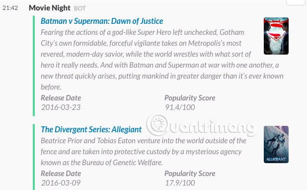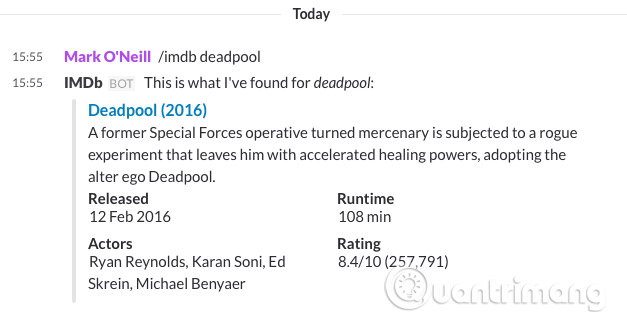 Trang web về phim được yêu thích trên thế giới hiện đã có Slackbot riêng. Tìm kiếm trên cơ sở dữ liệu IMDb để xem chi tiết về các bộ phim, giống như cách bạn sử dụng Movie Night, nhận thông tin về ngày phát hành, thời gian chiếu, diễn viên và xếp hạng của những bộ phim mới.