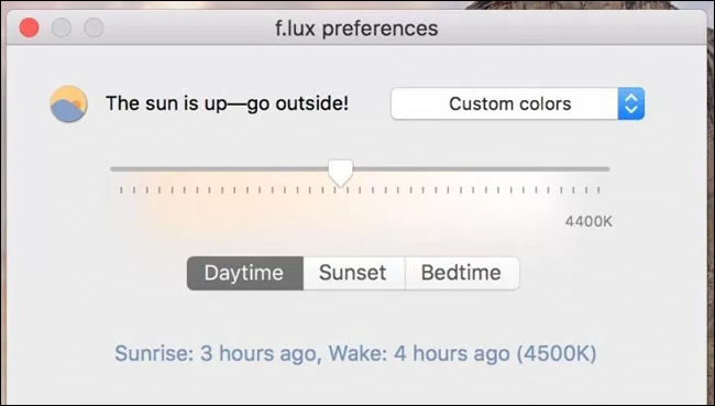 Nhưng những bản macOS thấp sẽ không được nâng cấp tính năng này. Nếu vậy chúng ta có thể cài đặt ứng dụng F.lux, với những tùy chọn chuyển đổi nhiệt độ màu và chuyển tiếp dần dần theo từng giai đoạn. Ngoài ra, người dùng sẽ có tùy chọn điều chỉnh nhiệt độ màu máy Mac theo thời gian, tông màu chuyển sang mát hơn khi có mặt trời, ấm hơn vào buổi chiều và dịu hoàn toàn khi vào buổi tối.
