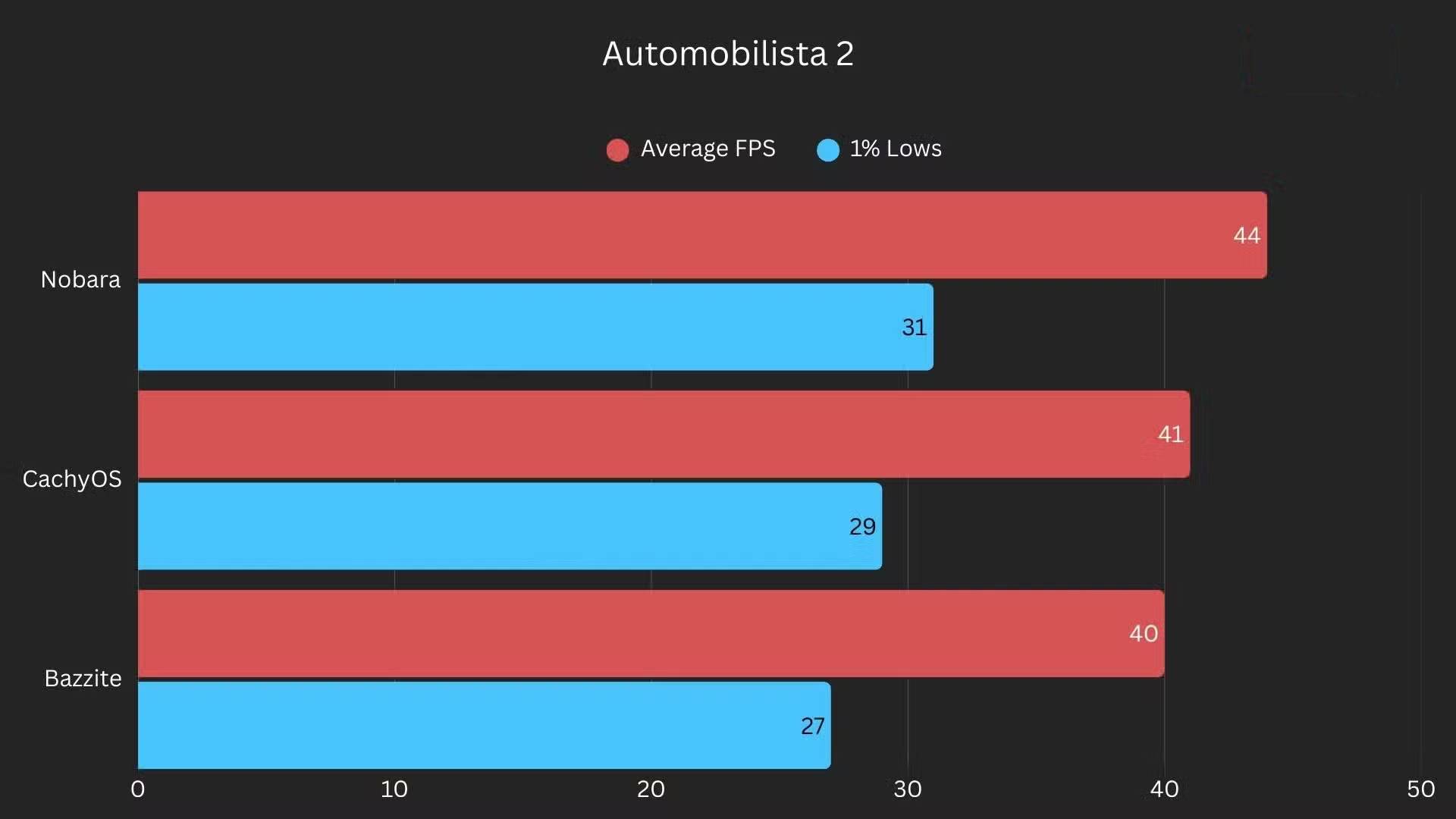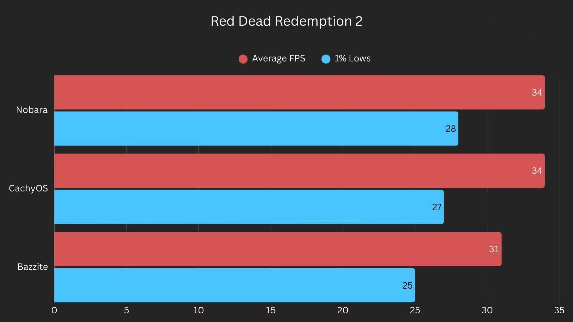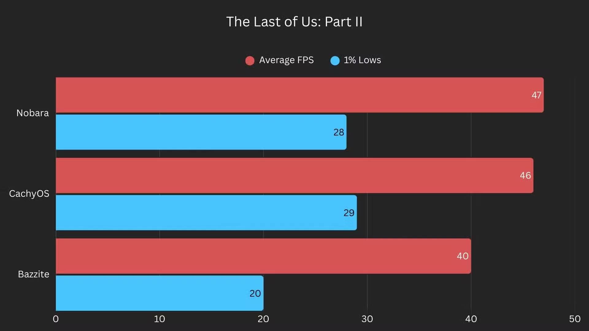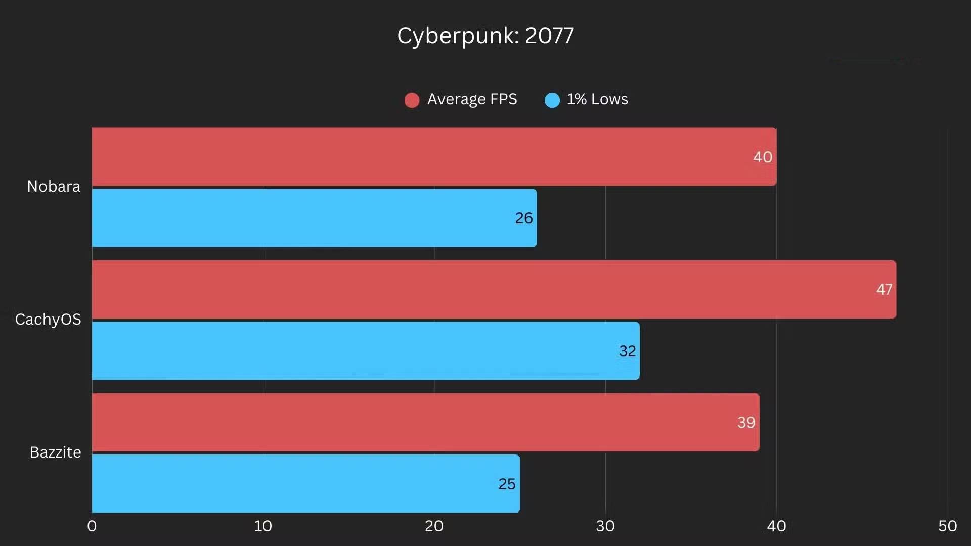 Thực tế thì hoàn toàn khác. Nobara thực chất sử dụng cùng một kernel CachyOS với những tinh chỉnh và sửa đổi riêng. Qua thử nghiệm, cả hai đều khá ngang ngửa nhau trong hầu hết các game.