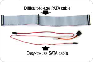 Ổ SATA có cáp gọn và bộ kết nối nhỏ hơn ổ ATA. Điều đó cho phép có nhiều kết nối hơn trong bảng mạch chính và nhiều dòng khí bên trong hộp máy. SATA còn đơn giản hoá phần cài đặt bằng cách sử dụng cấu trúc mạng point-to-point (điểm tới điểm), cho phép sử dụng một kết nối cho mỗi cổng và cáp. Cấu trúc này cải tiến hơn nhiều so với các jumper và kết nối master/slave của ổ PATA, trong cấu trúc của ổ PATA một cáp được dùng để kết nối 2 ổ. Không giống như PATA, SATA phù hợp với các ổ ngoài gắn trực tiếp, cho phép sử dụng cáp dài 2m trong một giao diện, góp phần cải tiến tốc độ hơn nhanh đáng kể so với USB 2.0 và FireWire. External SATA có bộ kết nối hơi khác hơn một chút, tốc độ được cải thiện, được thiết kế để khoá tại một chỗ, nhiều lỗi được sửa chữa và tính tương thích hoàn chỉnh.