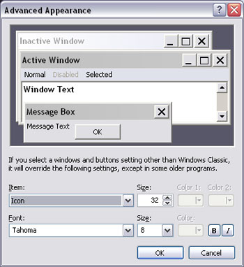 Windows Explorer và My Computer hiển thị cùng một font mà Windows XP sử dụng trên tiêu đề của icon desktop: font Tahoma, kích thước 8. Nếu bạn muốn thay đổi font hay kích thước font sử dụng trong Windows Explorer, hãy thực hiện theo các bước sau: