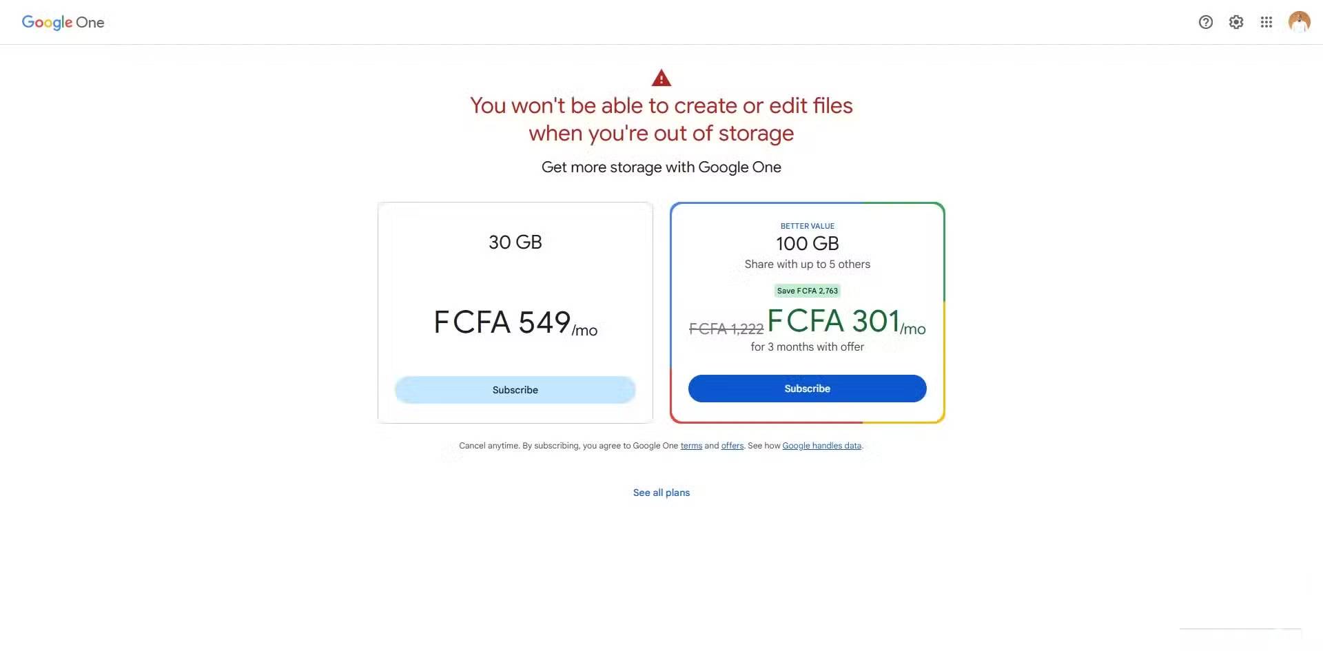 Quá trình này rất đơn giản và thông minh. Lấy Google làm ví dụ điển hình. Dung lượng lưu trữ Google Drive miễn phí có dung lượng 15GB, và vì dung lượng này được liên kết với tất cả các dịch vụ Google mà bạn đã kết nối, nên nó có thể nhanh chóng đầy. Vào thời điểm đó, bạn sẽ nhận được rất nhiều thông báo khuyến khích bạn đăng ký.