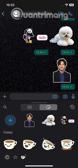 Tại giao diện trên ứng dụng WhatsApp, bạn nhấn vào đoạn chat. Tiếp đó chúng ta nhấn vào biểu tượng nhãn dán bên dưới. Hiển thị giao diện quản lý sticker, bạn nhấn vào dấu cộng để tạo sticker WhatsApp.