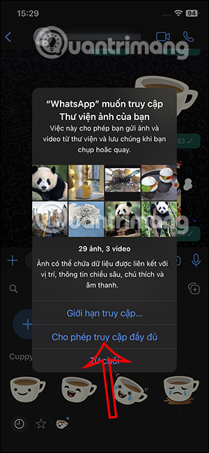 Lúc này bạn cần đồng ý để WhatsApp truy cập vào album ảnh trên điện thoại. Sau đó chúng ta nhấn vào ảnh muốn tạo sticker trong WhatsApp.