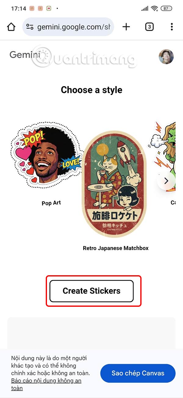 Sau khi tải ảnh lên bạn chọn tiếp phong cách sticker bên dưới rồi nhấn Create Stickers để tiến hành tạo sticker.
