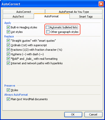 Bỏ chế độ tự động điền số thứ tự và ký tự đầu dòng tự động