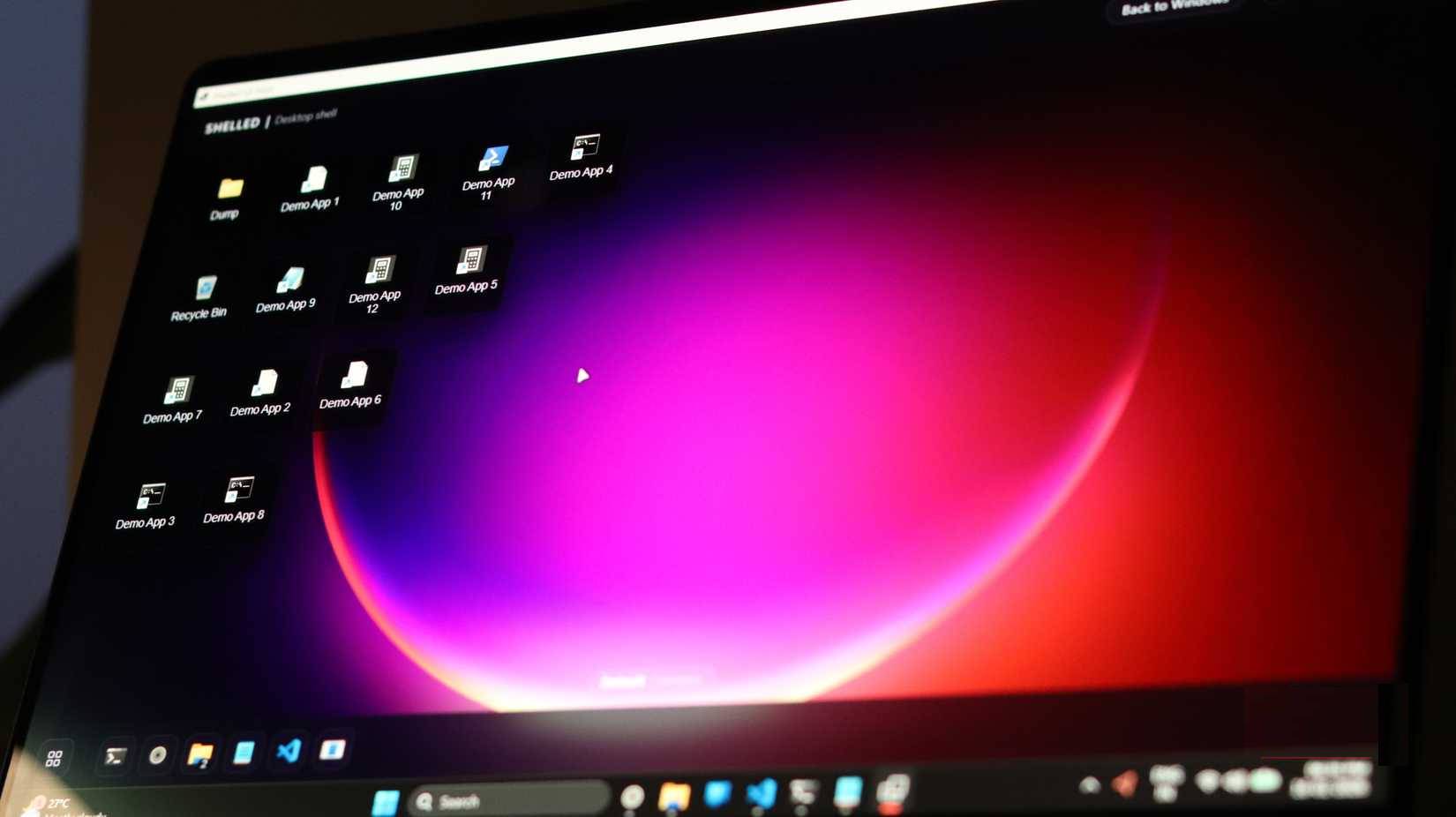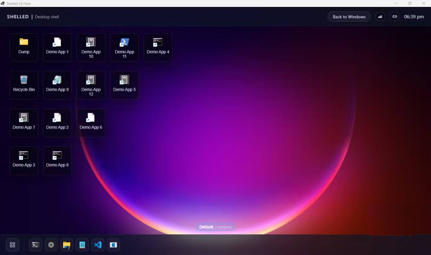 .\myshell-bootstrap.exeVà thế là xong! Bạn sẽ thấy một desktop toàn màn hình xuất hiện với taskbar launcher và dải không gian làm việc của Shelled. Explorer vẫn đang chạy bên dưới, vì vậy bạn có thể: