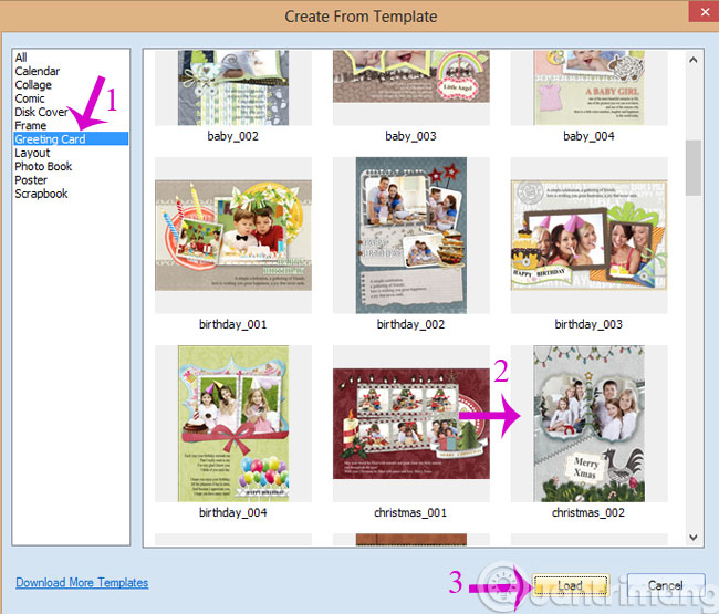 Bước 2: Tại giao diện cửa sổ mới, hãy chọn Greeting Card ở menu trái rồi chọn mẫu thiệp mà mình thích ở bên phải. Sau đó, nhấn Load.