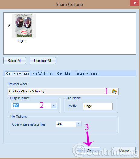 Bước 8: Trong hộp thoại Share Collage, hãy tiến hành thay đổi 1 vài tùy chọn cho đầu ra rồi nhấn OK