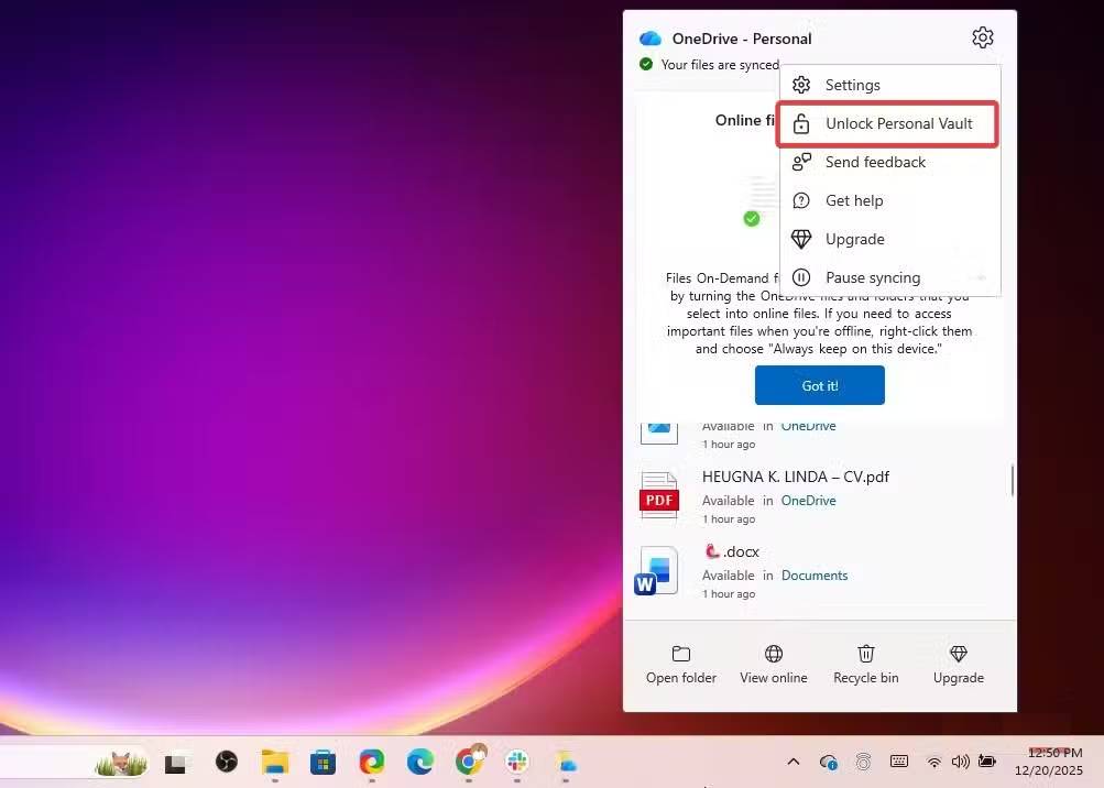 Để mở khóa Personal Vault lần đầu tiên, hãy nhấp vào biểu tượng OneDrive trên thanh tác vụ và chọn Unlock Personal Vault. Một trình hướng dẫn sẽ chỉ dẫn bạn, và sau khi hoàn tất, bạn sẽ có thể sử dụng khu vực an toàn này.