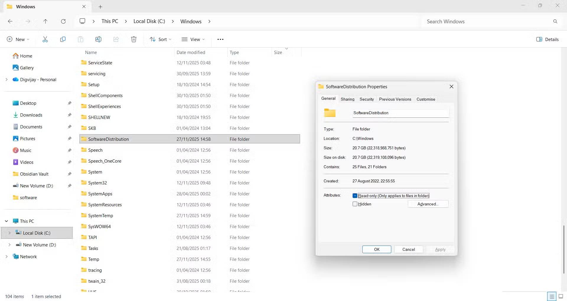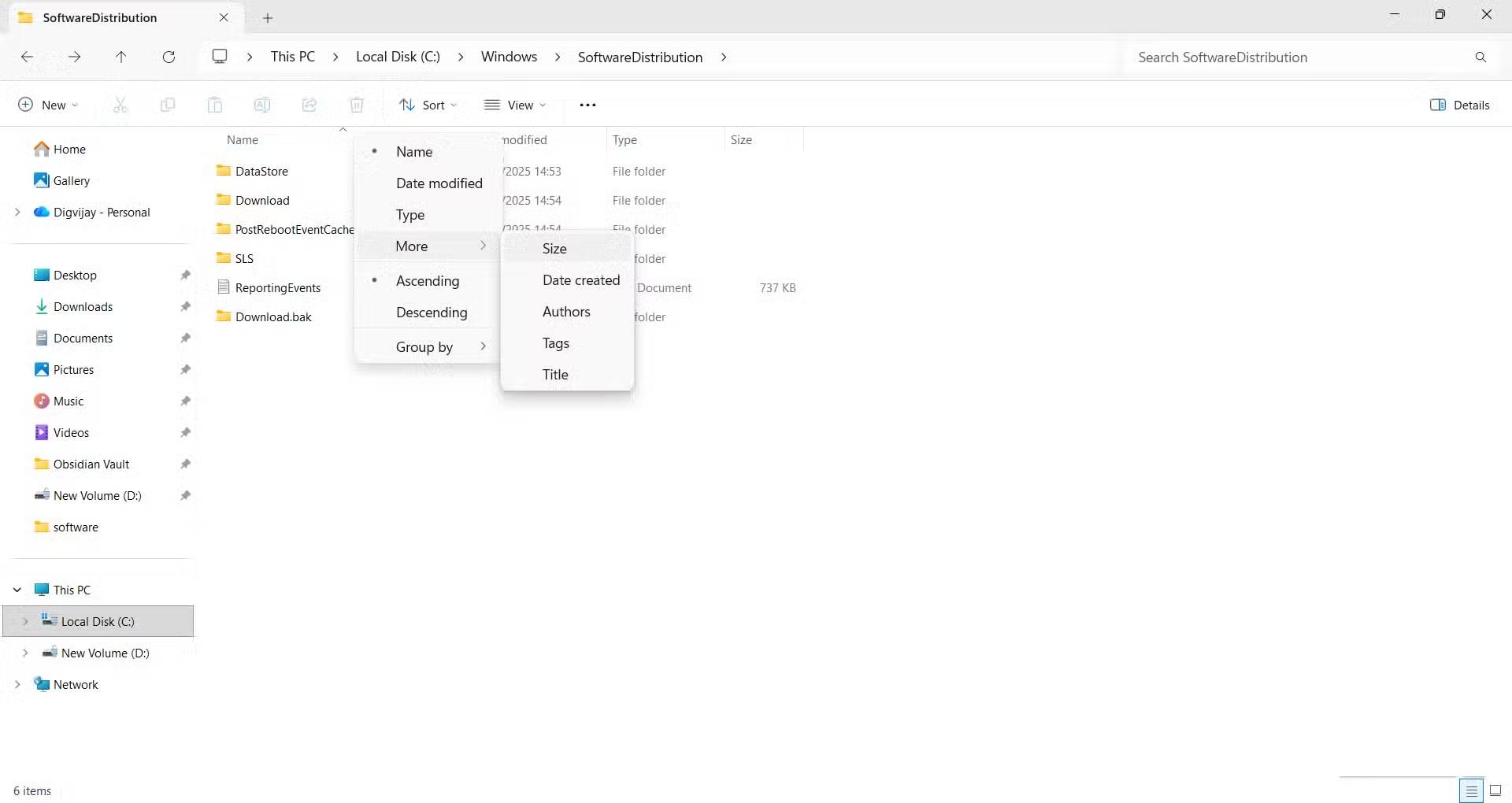 Nếu bạn trì hoãn cập nhật trong nhiều tháng, Windows có thể giữ lại các file cache cũ hơn thay vì xóa chúng ngay lập tức. Theo thời gian, chúng tích tụ âm thầm và có thể lên đến hàng chục gigabyte, đặc biệt là trên các hệ thống đã trải qua nhiều lần nâng cấp tính năng. Vì SoftwareDistribution nằm trong thư mục Windows, các công cụ dọn dẹp tích hợp như Storage Sense không phải lúc nào cũng xóa những file được lưu trong cache.