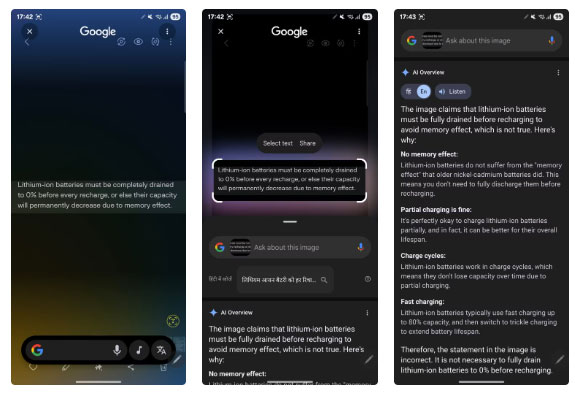 Bắt đầu bằng cách mở trang, ảnh hoặc đoạn văn bản có chứa nội dung mà bạn muốn xác minh. Sau đó, kích hoạt Circle to Search và chọn nội dung có thông tin nghi bị sai lệch. Sau đó, Circle to Search sẽ tự động tra cứu trên Internet và trả về phản hồi cho thông tin đó trong bảng kết quả Google Search.