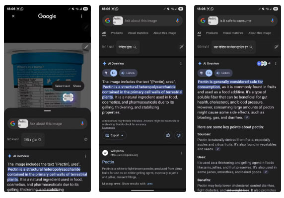 Để thực hiện việc này, trước tiên, hãy chụp ảnh bao bì thực phẩm. Ngoài ra, hãy mở ảnh nếu bạn đã có trong thư viện ảnh hoặc ứng dụng khác. Sau đó, mở Circle to Search và highlight khu vực có thành phần. Bạn sẽ thấy phản hồi trên màn hình với một loạt thông tin liên quan đến các thành phần bạn đã chọn. Nếu bạn muốn tìm hiểu thêm hoặc có thắc mắc về một thành phần nào đó, hãy nhập thông tin đó vào thanh tìm kiếm ở trên cùng.