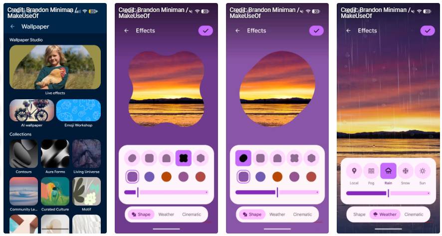Một trong những tính năng mới thú vị và quan trọng nhất của Material 3 Expressive là Wallpaper Effects, cho phép bạn thực sự tận dụng hình nền của mình với các hiệu ứng Shape (sẽ cắt gọn hình nền của bạn theo hình dạng cụ thể - tuyệt vời cho phong cách tối giản), hiệu ứng Weather (ứng dụng này sẽ áp dụng hiệu ứng hoạt ảnh thời tiết chân thực lên hình nền của bạn, bao gồm cả tùy chọn sử dụng dữ liệu thời tiết địa phương để khi trời mưa ở nơi bạn đang ở, sẽ có những "giọt mưa" chân thực hình thành trên hình nền của bạn); và hiệu ứng Cinematic, sẽ làm cho hình nền của bạn hơi chuyển động và trở nên sống động hơn trên màn hình chính.