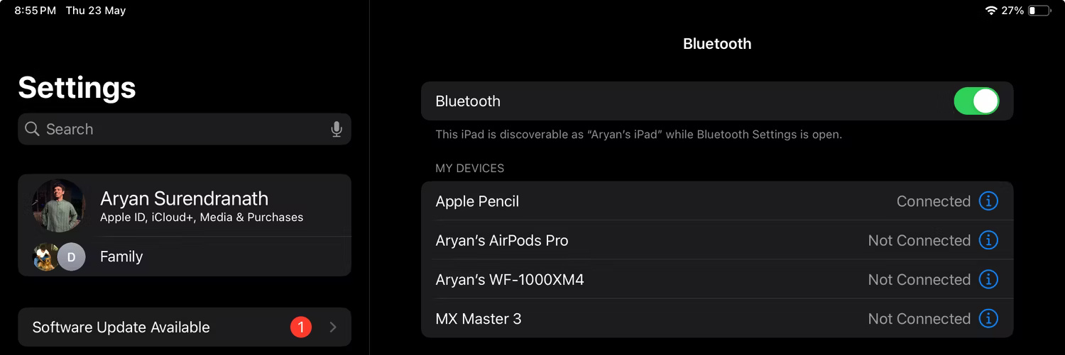 Để kiểm tra xem Apple Pencil có ở gần hay không, hãy đi tới Settings > Bluetooth > My Devices trên iPad. Nếu Apple Pencil xuất hiện ở trạng thái Connected, nó chắc chắn phải nằm trong phạm vi 9m vì đó là phạm vi của Bluetooth.