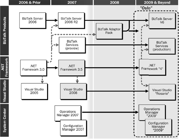 Các công nghệ mà Oslo sẽ được cung cấp trong một tập các sản phẩm bắt đầu vào năm 2009. Thể hiện ở đây là gần như một lịch trình cho các phát hành. Oslo là một tên mã cho việc phân phối sáng kiến của Microsoft về các công nghệ thư tín và luồng công việc, công nghệ này bổ sung thêm quá trình doanh nghiệp mới dựa trên các ứng dụng doanh nghiệp đang tồn tại của một tổ chức (ví dụ như hệ thống hoạch định tài nguyên doanh nghiệp [ERP]) và truyền thông với các ứng dụng doanh nghiệp này thông qua dịch vụ Web. |