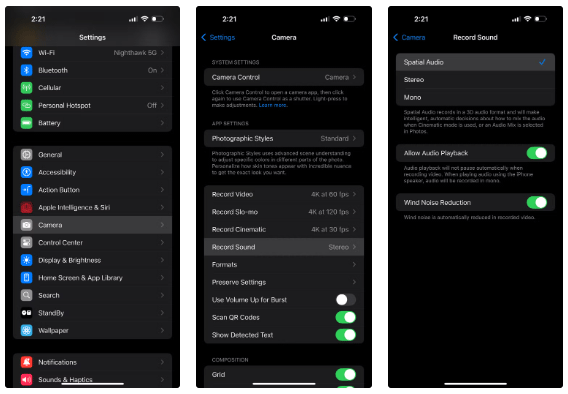 Khi xuất xưởng, tất cả các mẫu iPhone 16 đều quay video với Spatial Audio đã kích hoạt. Tuy nhiên, nếu bạn đã chỉnh sửa cài đặt camera, hãy vào Settings > Camera > Record Sound và kiểm tra xem Spatial Audio đã được chọn chưa.