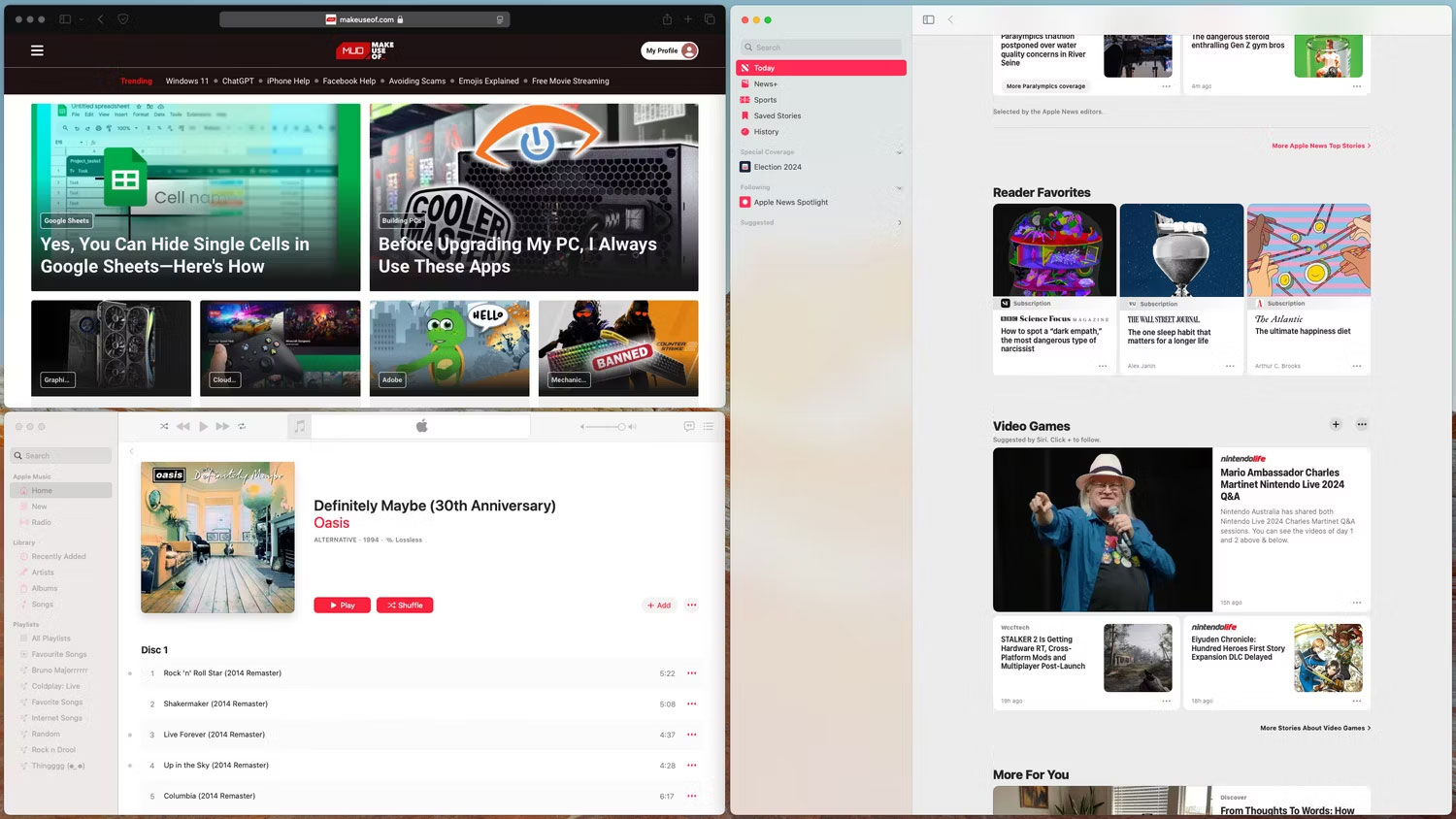 Trước đây, bạn có thể thêm chức năng này bằng ứng dụng của bên thứ ba như Rectangle. Tuy nhiên, macOS Sequoia có trình quản lý cửa sổ được cải tiến hoàn toàn, cho phép xếp cửa sổ theo dạng tile chỉ bằng cách kéo chúng ra rìa màn hình, tại đó chúng sẽ tự động khớp vào đúng vị trí.