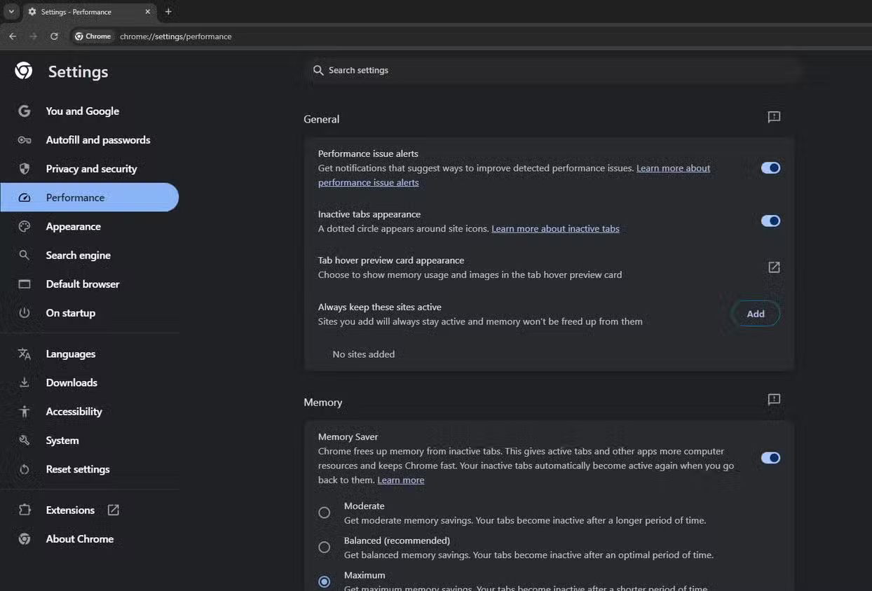 Thứ hai, Google đã cải thiện tính năng Memory Saver hiện có được giới thiệu lần đầu tiên vào năm 2022. Tính năng này giải phóng bộ nhớ khỏi các tab không hoạt động, cho phép bạn sử dụng tài nguyên ở nơi thực sự cần. Bây giờ, bạn có thể chọn giữa các chế độ Moderate, Balanced và Maximum, tùy thuộc vào sở thích của mình.