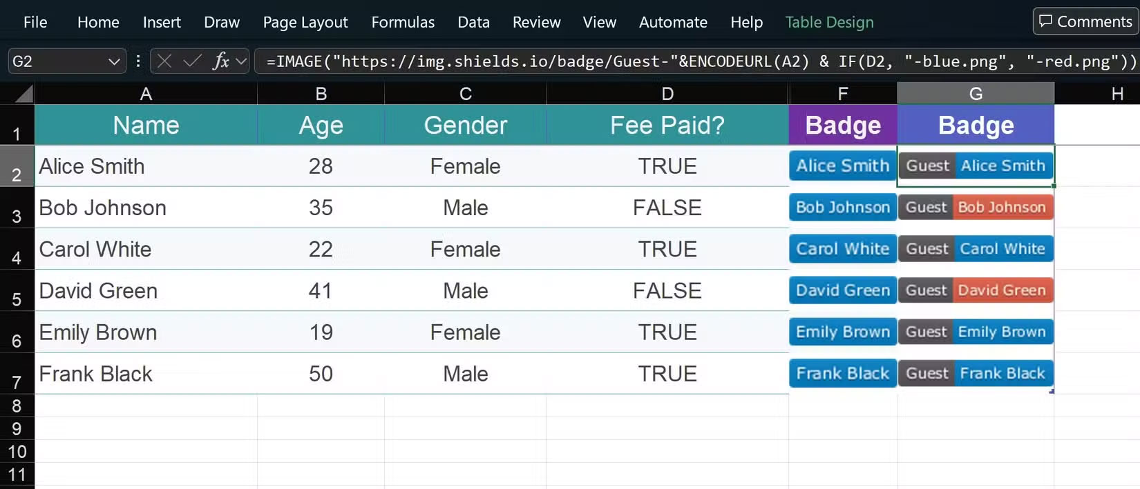 =IMAGE("https://img.shields.io/badge/Guest-"& ENCODEURL(A2) & IF(D2, "-blue.png?style=flat", "-red.png?style=flat"))