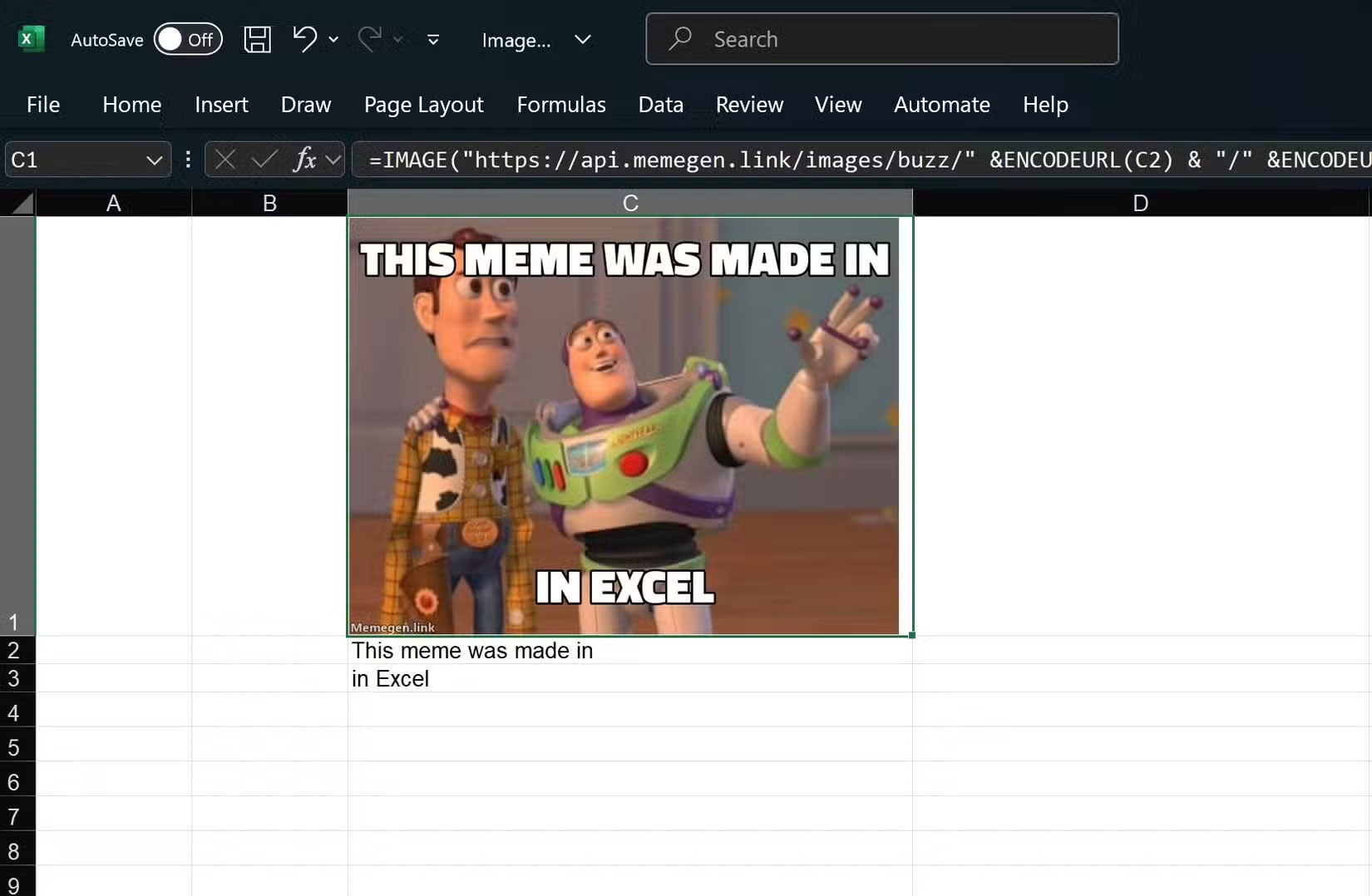Việc nhận ra rằng bạn có thể lấy hình ảnh tùy ý thông qua URL biến Excel thành một giao diện người dùng nhẹ nhàng cho tất cả các loại API. Bạn thậm chí còn sử dụng API Memegen để tạo meme bên trong Excel. Phần chữ trên cùng và dưới cùng được phân tách bằng dấu gạch chéo, vì vậy, để tạo meme đơn giản: